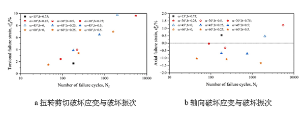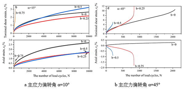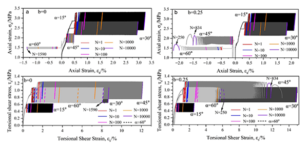 基于上述科學問題,中國科學院西北生態環境資源研究院科研團隊采用凍土空心圓柱設備模擬主應力偏轉角、中主應力系數和大主應力幅值恒定的循環應力狀態(圖1),系統研究了-6℃條件下三維應力參數(主應力偏轉角和中主應力系數)對凍結青藏粉質粘土變形行為(圖2)、應力應變特征(圖3)、損傷演化發展規律及疲勞破壞特性的影響。研究結果表明,三維應力參數對凍土的變形行為具有極為顯著地影響,并對凍土的疲勞破壞進程具有明顯的加速作用(圖4)。傳統的凍土動力學研究方法所獲取的測試結果往往會高估復雜三維應力狀態下的凍土抵抗變形和疲勞破壞的能力。該研究成果有助于提升對高路堤邊坡下的凍土地基、凍土基坑、邊坡,以及在地下工程施工中遇到的人工凍結體等處于復雜三維應力狀態下的凍土在地震及車輛等荷載擾動下穩定性的認識。