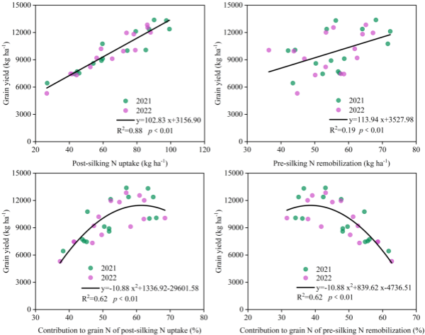 圖4 吐絲后N吸收、吐絲前N轉(zhuǎn)運(yùn)及對(duì)籽粒N貢獻(xiàn)與產(chǎn)量的關(guān)系