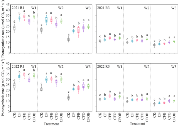 圖1 不同水肥處理對(duì)玉米R(shí)1和R3時(shí)期光合作用的影響