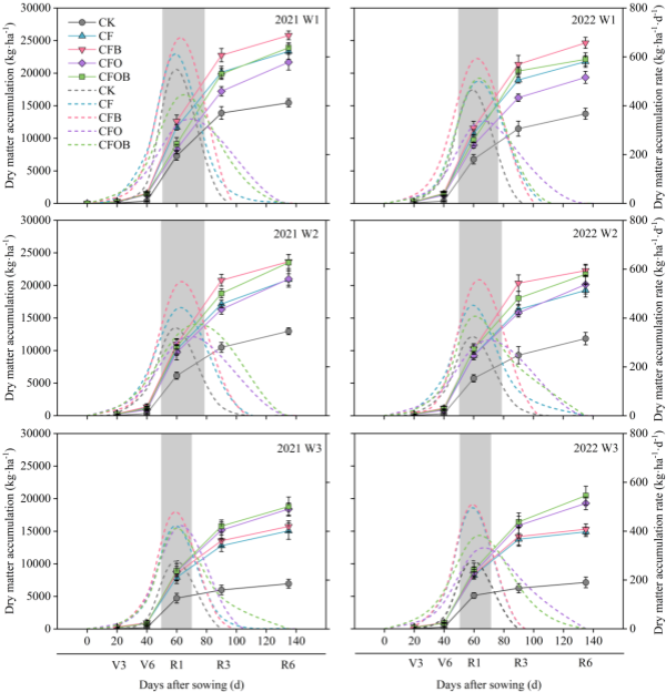 圖2 不同水肥處理對(duì)玉米干物質(zhì)積累和積累速率的影響