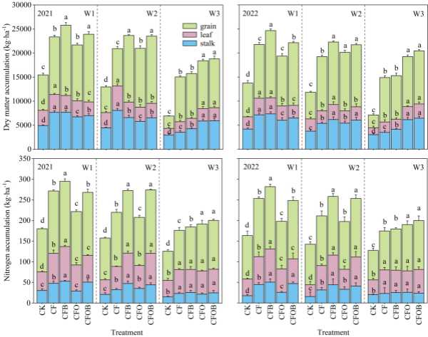 中國(guó)科學(xué)院西北生態(tài)環(huán)境資源研究院科研人員以科爾沁沙地淺埋滴灌玉米 (Zea mays L. ) 為研究對(duì)象,通過(guò)設(shè)置不同的灌溉和施肥處理,研究不同水肥處理對(duì)玉米生長(zhǎng)發(fā)育、作物產(chǎn)量、水分生產(chǎn)力、氮素利用效率和經(jīng)濟(jì)效益的影響。研究表明,適度減少灌溉量條件下 (140 mm),與化肥、有機(jī)肥單施或化肥與有機(jī)肥、生物肥配施相比,綜合施用化肥、有機(jī)肥與生物肥能夠提高玉米葉面積指數(shù)、光合速率(圖1)、生育后期干物質(zhì)積累速率和積累量(圖2、圖3),同時(shí)能夠促進(jìn)吐絲后氮素積累及籽粒氮貢獻(xiàn)率(圖3、圖4),提高作物生育后期光合物質(zhì)生產(chǎn)、氮素吸收和氮素利用率,提高作物水分生產(chǎn)力、優(yōu)化作物階段耗水量,最終提高作物產(chǎn)量,獲得最高的經(jīng)濟(jì)效益,是適宜于當(dāng)?shù)刈顑?yōu)的水肥施用模式。