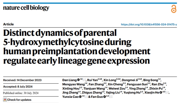 2024年7月30日,中國科學院動物研究所郭帆團隊、安徽醫科大學第一附屬醫院曹云霞/梁丹團隊和上海交通大學醫學院附屬第一人民醫院賀小進合作(安徽醫科大學第一附屬醫院教授梁丹、副教授紀冬梅,中國科學院動物研究所博士生燕蕊、博士后龍鑫為本文共同第一作者),在Nature Cell Biology發表了題為“Distinct dynamics of parental 5-hydroxymethylcytosine during human preimplantation development regulate early lineage gene expression”的研究論文。研究者利用微量細胞5hmC全基因組解析方法結合胚胎成像、染色質免疫沉淀和相關功能實驗,對人早期胚胎中5hmC的動態與功能作用進行了系統解析。研究者發現人卵細胞在生長過程中經歷了從頭DNA羥甲基化從而累積了顯著水平的5hmC;受精后,母本基因組會繼承卵細胞中的5hmC,而父本基因組中的5hmC則會部分“參照”母本基因組產生,這一模式區別于小鼠早期胚胎中5hmC的不對稱性分布。人早期胚胎中的5hmC除了參與DNA甲基化擦除事件外,還與維持性DNA甲基化區域關聯;以上結果說明人與小鼠早期胚胎中5hmC的起源與動態并不保守。人早期胚胎中部分5hmC修飾會維持至八細胞時期,并且富集在OTX2、TFAP2C和KLF4/5等轉錄因子的結合基序上。研究人員通過5hmC的耗竭或者異位產生實驗以及人早期胚胎中OTX2的敲降實驗,證明了5hmC-增強子-OTX2的互作對于人早期胚胎發育的調控作用。這些發現揭示了5hmC在人早期胚胎發育中的獨特動態以及功能多面性,為理解人早期胚胎發育過程中的多能性建立、細胞譜系分化和轉錄-表觀調控之間的關系奠定重要基礎。郭帆、曹云霞、梁丹和賀小進為該研究論文的共同通訊作者,該研究工作得到了國家自然科學基金委、國家科技部和中國科學院提供的多項項目資助。