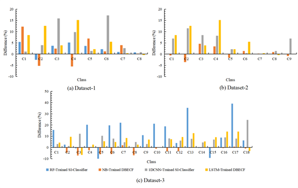 不同分類算法下DBECF和單實體分類器(SI-Classifier)之間的精度差