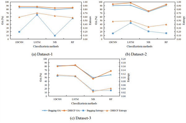 不同分類算法下Bagging和DBECF的總體精度(OA)和熵(Entropy)