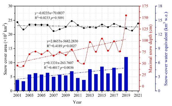 圖2 2000-2021年中國境內阿爾泰山積雪面積、最大雪深和積雪水當量變化