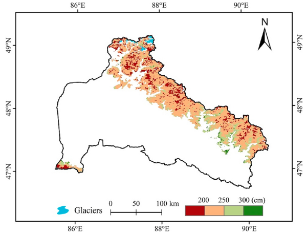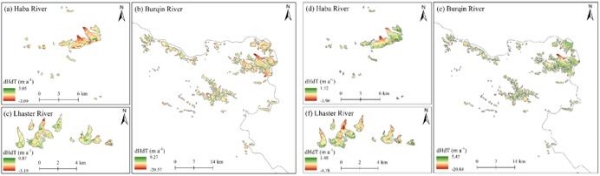 依托中國科學院西北生態(tài)環(huán)境資源研究院阿爾泰山冰凍圈科學與可持續(xù)發(fā)展綜合觀測研究站,冰凍圈科學國家重點實驗室科研團隊綜合運用衛(wèi)星遙感手段和野外實測數(shù)據(jù),系統(tǒng)研究了中國境內阿爾泰山在2000-2021年冰川、積雪和多年凍土的變化特征,評估了冰川、積雪和多年凍土對區(qū)域水資源的影響。研究發(fā)現(xiàn),受升溫和固態(tài)降水增加影響,2000年以來中國境內阿爾泰山的冰川呈持續(xù)退縮減薄,與2000-2010年相比,2010-2021年中國境內阿爾泰山冰川在面積退縮和表面高程減薄方面有所減緩(圖1)。2000-2021年積雪水當量和雪深明顯增加,盡管積雪面積呈微弱減小趨勢(圖2)。多年凍土面積減小、活動層厚度增加(圖3)。總體來說,中國境內阿爾泰山冰凍圈要素對河川徑流的貢獻約為41.9%,其中積雪融水對河川徑流的貢獻最大,約為37.1%,冰川融水徑流貢獻約為2.9%~3.4%,多年凍土的貢獻約為0.6%。