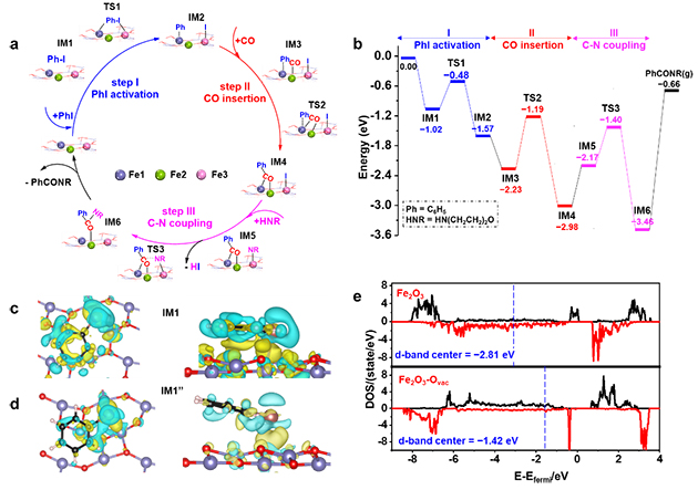 圖三 . 碘苯和胺在Fe2O3-Ovac催化劑上的催化循環(huán)和反應(yīng)能壘(a,b)和在Fe2O3-Ovac和Fe2O3催化劑表面碘苯吸附的差分電荷密度(c,d)以及Fe2O3-Ovac和Fe2O3催化劑表面Fe1和Fe3的d帶中心研究(e)