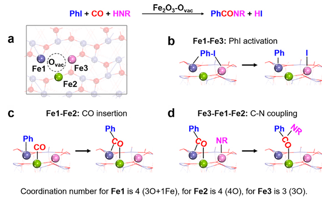 圖一 . Fe2O3-Ovac催化劑中三個不同的Fe位點組合催化碘苯和胺的羰基化反應(yīng)