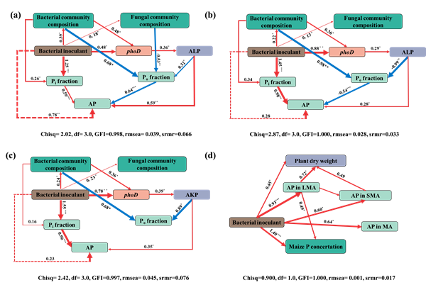 圖3 結構方程模型揭示了微生物菌劑提高土壤磷的有效性和玉米生長的直接作用和間接作用