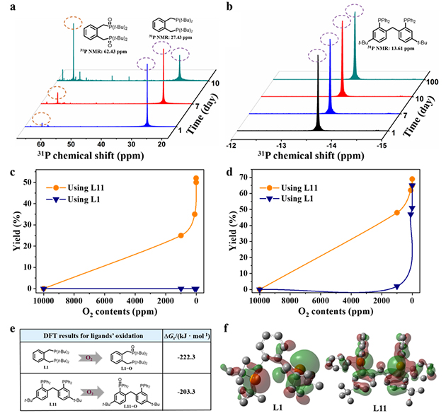 耐氧穩定性研究從實驗和理論兩個層面證明了芳基雙齒膦配體L11具有更優異的耐氧穩定性,揭示了L11上更強的電子離域導致的缺電子P是L11擁有更強耐氧穩定性的原因(圖3)。