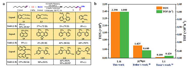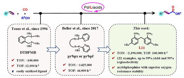 該研究工作實現了新型高效的芳基雙齒膦配體在烯烴氫酯基化反應中的應用,為進一步發展適用于羰基化反應的新型膦配體提供了思路。