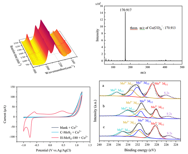圖3. H-MoS2促進醋酸鈷生成的四羰基鈷負離子的原位紅外光譜(左上);電噴霧質譜圖(右上);電化學循環伏安圖(左下);H-MoS2的X-射線光電子能譜(右下)