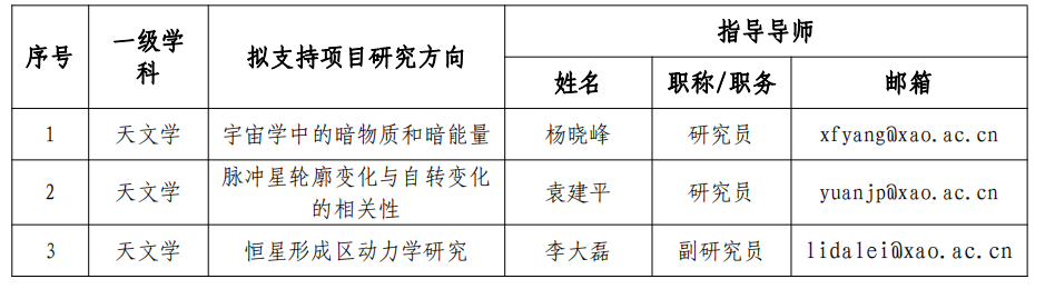 中科院新疆天文臺現開展2022年大學生“科創計劃”項目申報工作,“科創計劃”項目指南詳見下表。在校大學生可根據自己的專業興趣,選擇相應項目和指導教師(在申請學生本校可設共同指導教師)。有意向的學生在與項目指導教師充分溝通后,登錄中國科學院大學科教結合協同育人行動計劃( ),選擇“科創計劃”進行注冊,然后在網上進行項目填報,請注意隨時保存信息。全部填報完畢并確認無誤后,點擊提交,下載并打印申請表,請學籍所在學校(或學院)簽字蓋章后寄至項目設立導師,導師簽字同意后交天文臺研究生部。