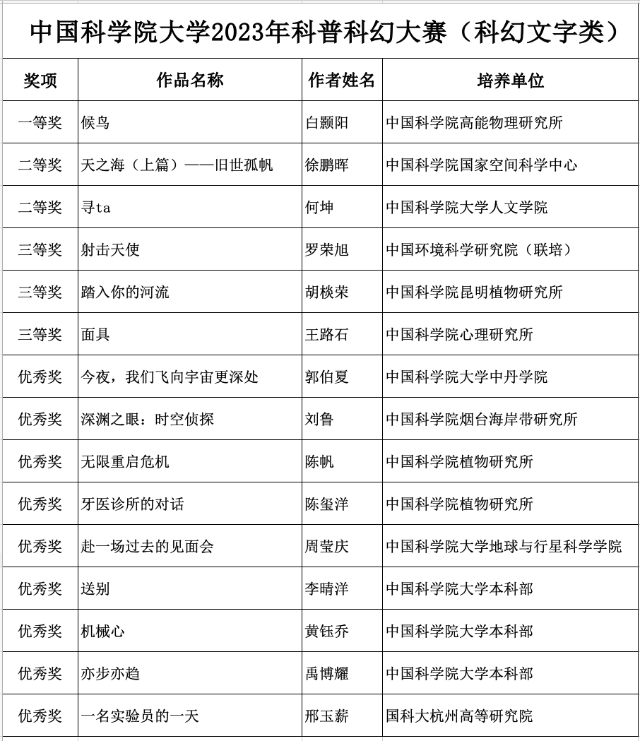 大賽邀請多位科普作家、科幻作家、科普影視專家、短視頻平臺相關(guān)負(fù)責(zé)人擔(dān)任評委,最終評選出一等獎作品3個、二等獎作品6個、三等獎作品9個,優(yōu)秀獎作品23個。獲獎?wù)哒埩粢忄]箱后續(xù)通知。