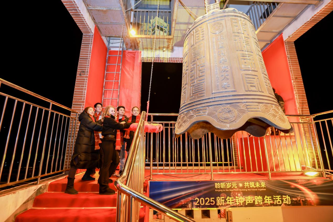 時間使者在雁棲湖校區(qū)標志性建筑鐘樓頂部敲響新年鐘聲