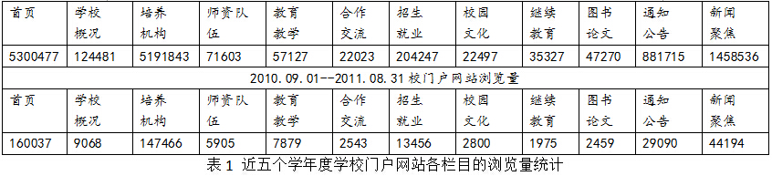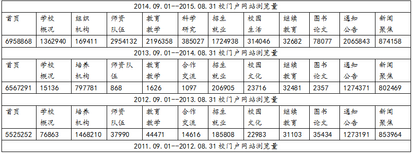 學(xué)校主頁公開信息包括學(xué)校概況、組織機構(gòu)、師資隊伍、教育教學(xué)、科學(xué)研究、招生就業(yè)、校園生活、 通知公告、新聞聚焦、科苑學(xué)子、教學(xué)研究、校園活動、快速通道、光影國科大等欄目。2014-2015年度,通過學(xué)校門戶網(wǎng)站了解學(xué)校相關(guān)信息的人次數(shù)比上一年度有大幅增加(表1)。首頁的瀏覽量比上一年度增加39.2萬人次;此外,通知公告作為相關(guān)信息公開的主要欄目,瀏覽量較上一學(xué)年度增幅為62.11%,達(dá)到206.6萬人次。從近五個學(xué)年來看,信息更新快的欄目瀏覽量也呈上升的狀態(tài),如首頁和通知公告的瀏覽量。