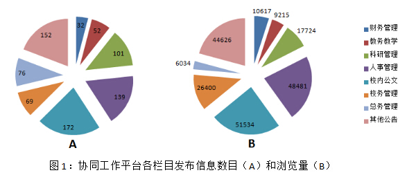 校內(nèi)協(xié)同工作平臺是教職工了解學(xué)校各項政策、規(guī)章制度、通知公告等相關(guān)信息的主要平臺。截至2015年8月31日,學(xué)校各職能部門和院系在協(xié)同工作平臺發(fā)布信息數(shù)目總共為12365條,信息種類涉及到財務(wù)、教務(wù)教學(xué)、科研、人事、公文等。其中,2014-2015學(xué)年度,協(xié)同工作平臺發(fā)布信息總數(shù)為1057條,比上一學(xué)年度上漲57%;瀏覽量為25萬人次,較上一學(xué)年度提高36%。