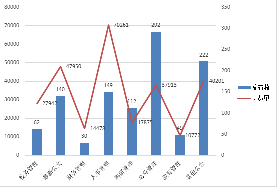 校內協同工作平臺是教職工了解學校各項政策、規章制度、通知公告等相關信息的主要平臺。截至2016年8月31日,學校各職能部門和院系在協同工作平臺發布信息數目總共為12521條,信息種類涉及到財務、教學、科研、人事、公文等。2015-2016學年,協同工作平臺校務管理、最新公文、財務管理、人事管理、科研管理、總務管理、教育管理、其他公告等欄目發布信息總數為1056條,與上一學年度持平。信息瀏覽量為26.7萬人次,較上一學年度提高6.8%。