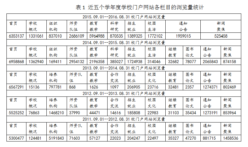 學校主頁公開信息包括學校概況、組織機構、師資隊伍、教育教學、科學研究、招生就業、校園生活、 通知公告、新聞聚焦、科苑學子、教學研究、校園活動、快速通道、光影國科大等欄目。2015-2016學年,學校門戶網站訪問量比上一年度增加461.7萬人次,增長24.1%(表1)。組織機構、教育教學、科學研究、校園生活訪問量均比去年有大幅度提升。